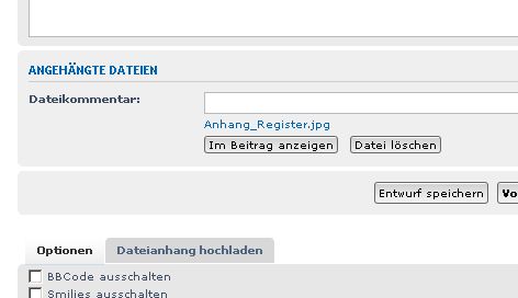 Wenn ihr einen Beitrag mit Anhang versehen wollt müsst ihr erstmal in dem Register unter dem Fenster den Reiter "Dateianhang hochladen" klicken. Dann auf "Auswählen..."