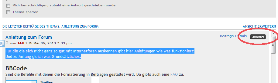 Wenn man das vermeiden und nicht den ganzen Beitrag zitieren möchte kann man auch einen Abschnitt markieren und dann den Knopf drücken. Dann wird nur der gewünschte Text (mit passender Syntax) im Editorfeld eingefügt.
