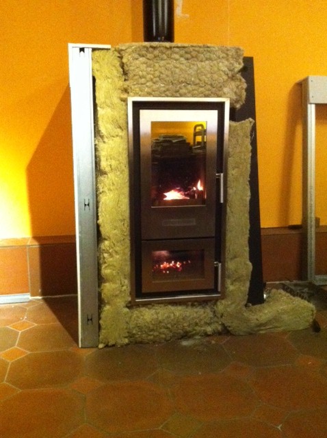 Daher habe ich auf eine technische Dämmung (KNAUF WM 640 GG Drahtnetzmatte) zurückgegriffen, die bis 640 Grad hitzebeständig ist.