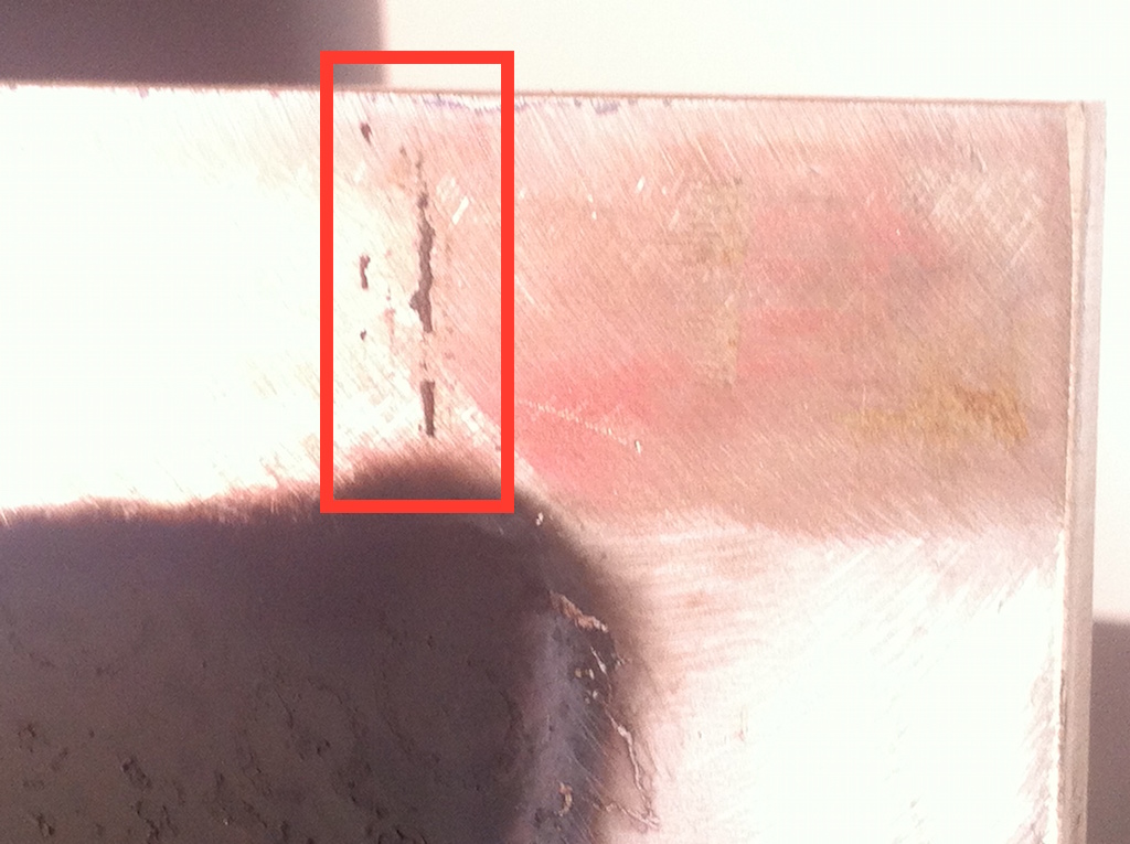 An der Unterseite der Kochplatte wurde allerdings eine winzige Rußspur innerhalb des blanken, von der Dichtung abgedeckten Randes gefunden. Dort, wo die Dichtung aufgrund der Endeinfassung auch sonst etwas schlechter ist. Es ist nicht mehr als ein schwarzer Strich von weniger als 1mm Stärke, aber diese Stelle ist nun die verdächtigste. Ja, es ist lächerlich klein, weshalb da leider auch nicht gleich was dran gemacht wurde. Aber gesucht wird ja auch nur ein ganz kleines Leck - erst durch die vielen Stunden Laufzeit summiert sich der Geruch so penetrant.