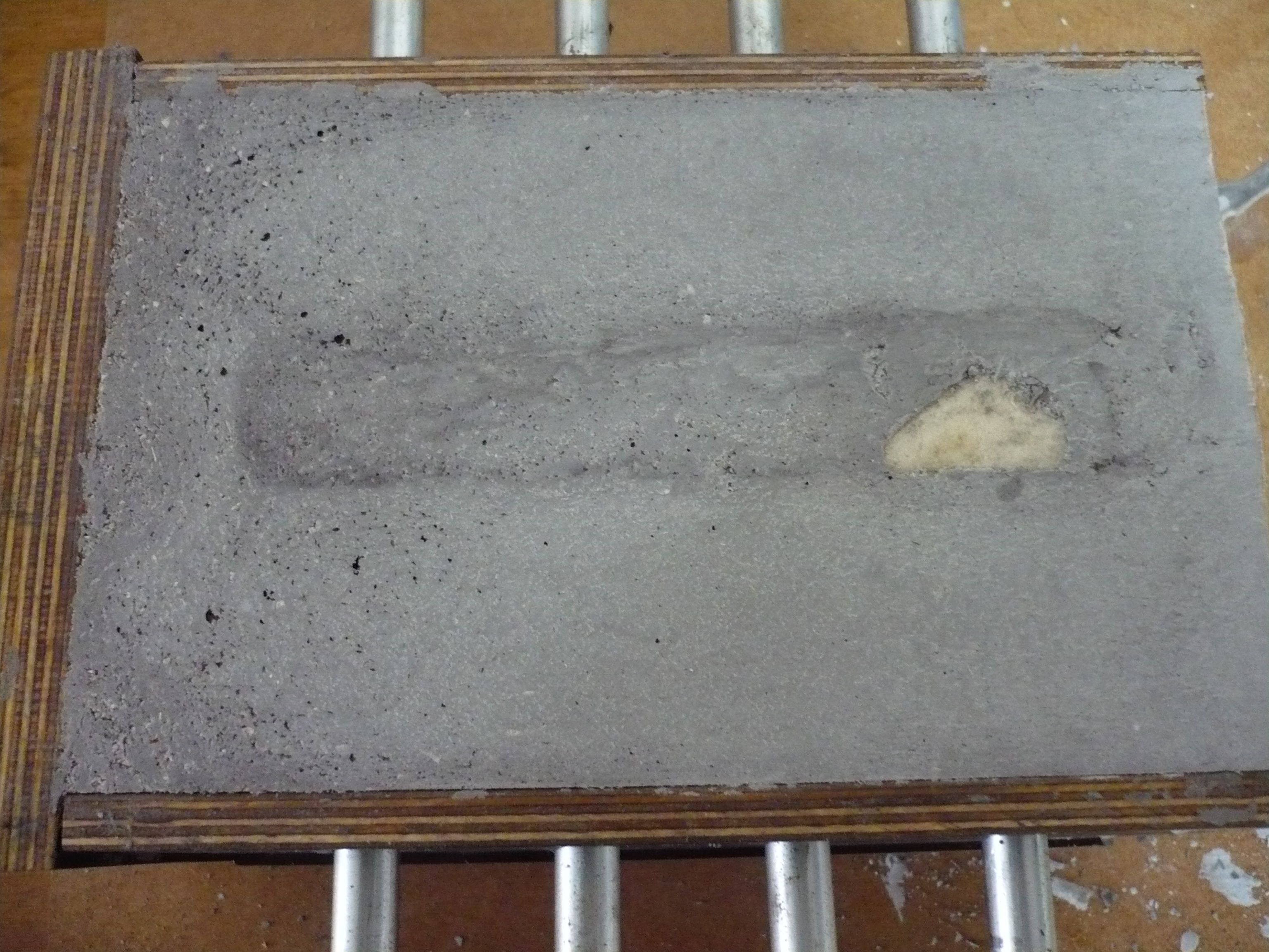 So siehts dann aus wenn der auf 4mm gesiebte Beton eingebracht ist. Hab meine Notizen geprüft: die letzten Male wurde mit 12% Wasseranteil gearbeitet.