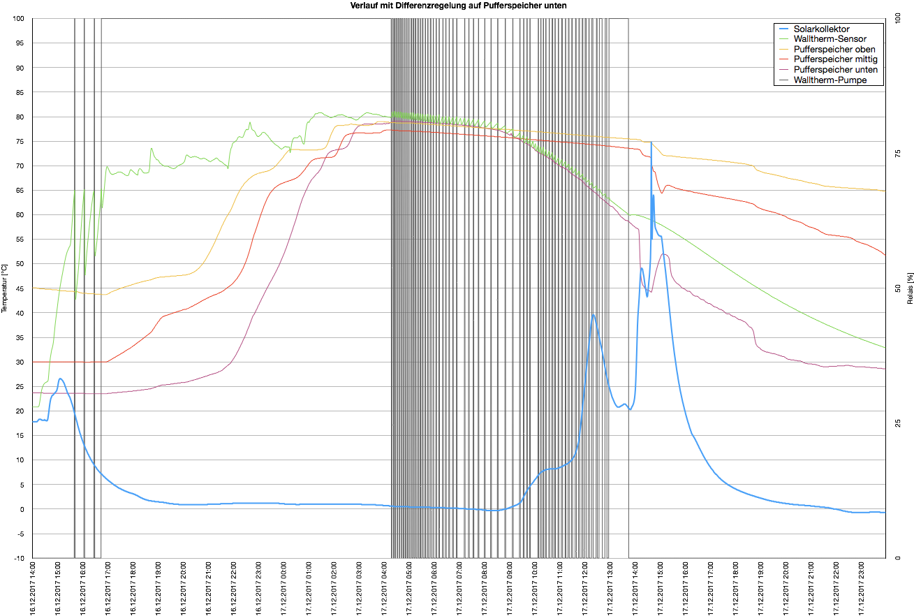 Man sieht schön wie zwischen 16 und 21Uhr die Pumpe unnötig läuft. Wie vor ein paar Beiträgen vorgeschlagen die Zubringertemperatur an die Rücklaufanhebung angepasst. Jetzt 65°C. Eine Situtation wie in http://wallthermfreunde.de/viewtopic.ph ... t=30#p2446 hatte ich seit der Umstelllung noch nicht.