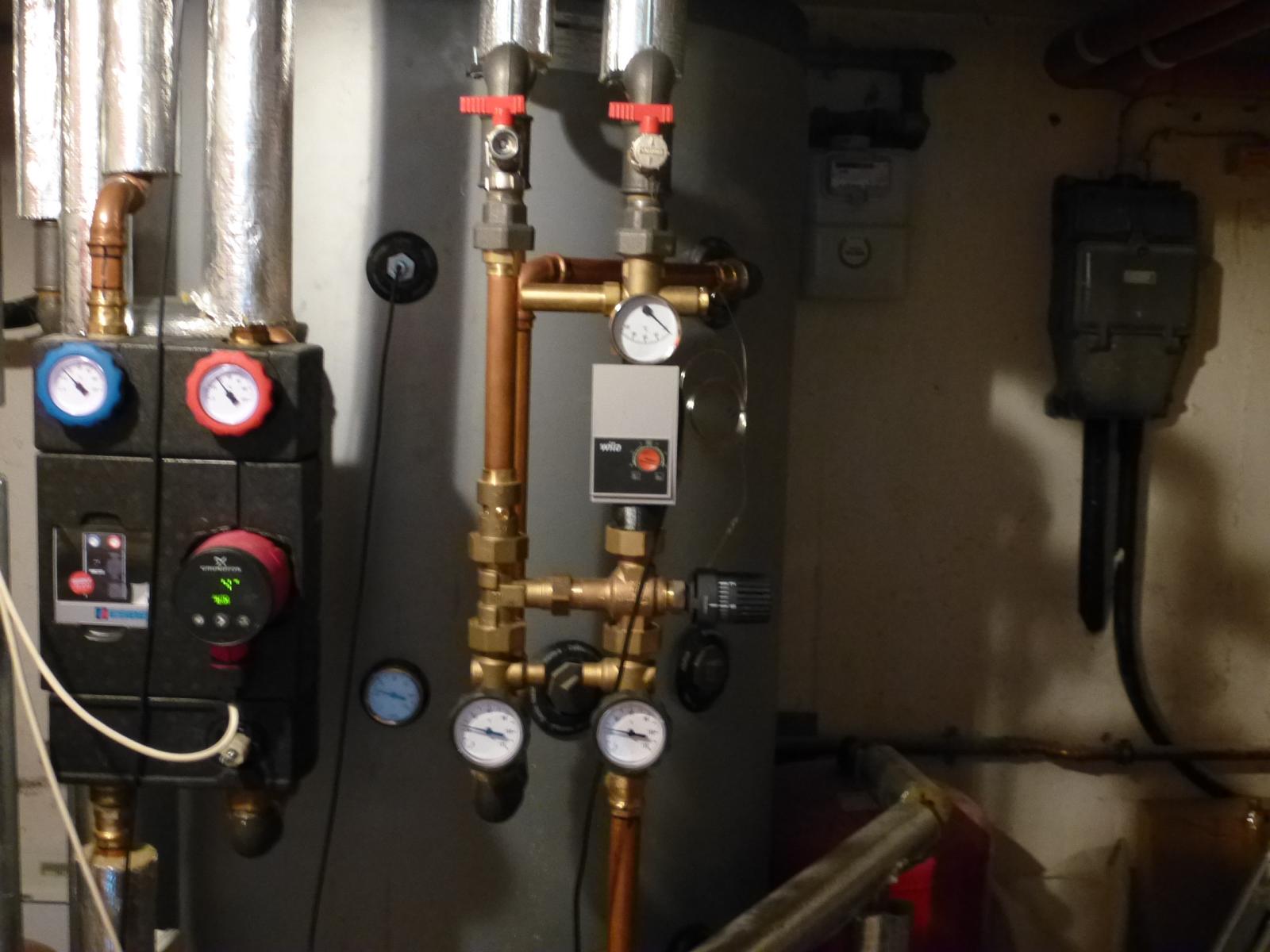 Ich hab in dem Bild mal die Anschlüsse beschriftet um sicher zu gehen das wir vom selben sprechen. Für den Ofen wichtig ist die Temperatur die an der Rücklaufanhebung eingestellt ist, abzulesen an dem Manometer das ich rot beschriftet hab.