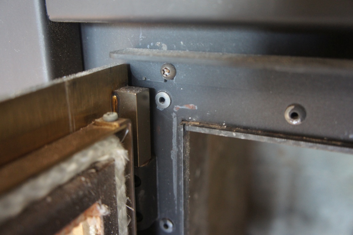 Meiner Meinung nach besteht das Problem in der Biegung im oberen Bereich der Brennraumtüre, die dazu führt, dass die Dichtschnur nicht plan am eingenieteten Anschlag, der nachgemessen komplett gerade ist, anliegen kann und es so zu einer Undichtigkeit kommt. Da die obere Brennkammer bei Betrieb komplett mit Holzgasen gefüllt ist lässt sich wohl auch bei vorschriftsmäßigem Kaminzug ein Austreten des Qualms am Türleck nicht verhindern.