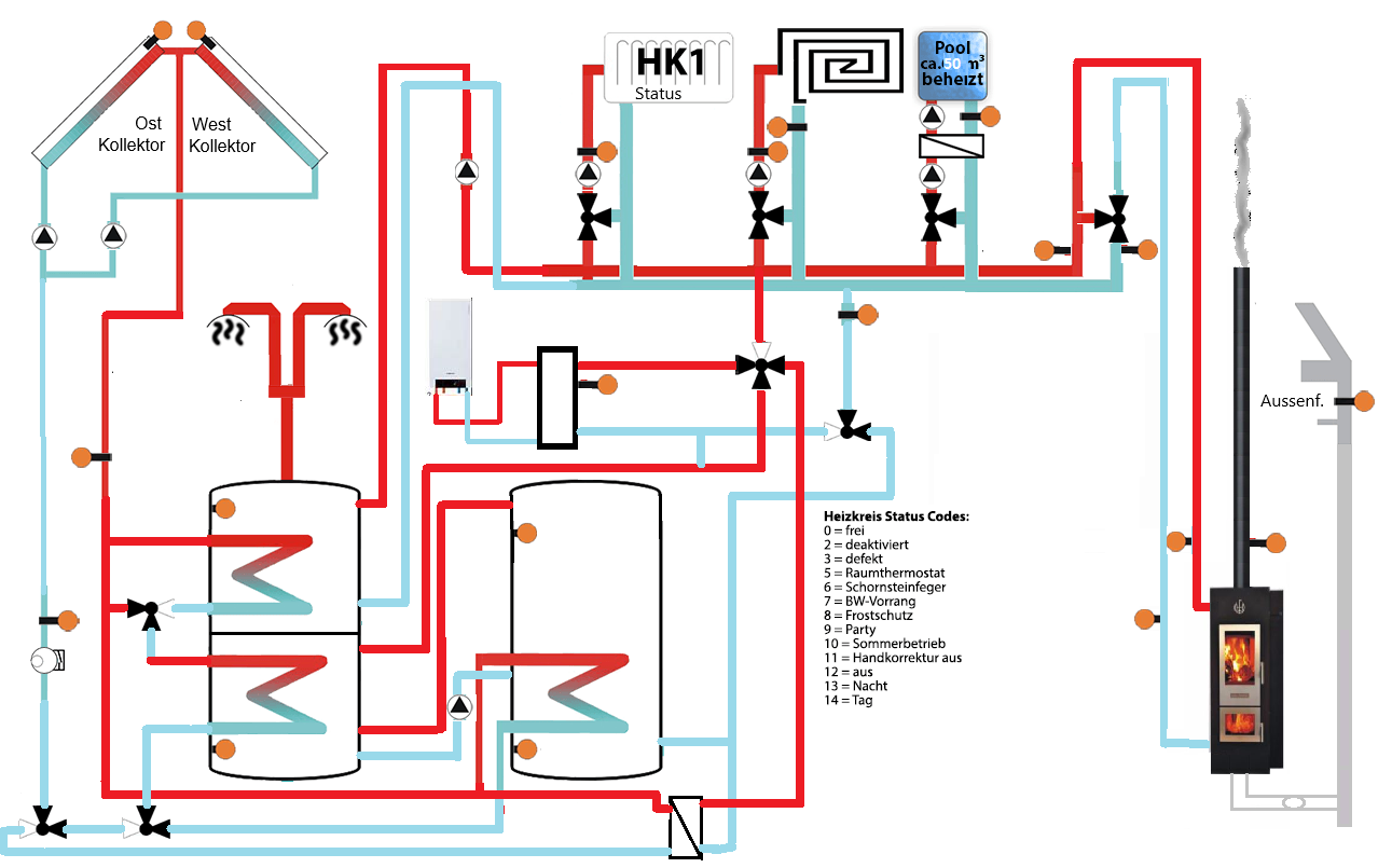 2011 habe ich für mein Haus eine Solarthermie Anlage mit Ost/West Ausrichtung selber montiert. Mit dabei war ein 1000l großer Pufferspeicher, der zunächst als Heizungsunterstützung gedacht war. Der alte Warmwasserspeicher wurde mit einem Drei Wege Ventil angesteuert. Da ja hier schon klar war, dass die alte Gas Heizung mal raus muss, wurde dann die Anlage 2013 um einen 1000l Hygiene Speicher erweitert. Somit hatte dann der Warmwasserspeicher ausgedient. 2015 wurde dann die Heizung so erweitert, das ein 5 Fach Verteilerbalken mit jeweils einem Dreifach und einem Vierfachen Ventil von ESBE ausgestattet. Das Dreifache Ventil ist für die Rücklaufanhebung, das Vierfache Ventil ist jeweils für die Gas Heizung, Speicher und für die direkte Solarunterstützung gedacht. Für den 5 Fachen Verteilerbalken waren Pumpengruppen für die Warmwasseraufbereitung der Hygiene Speicher, für die Heizkörper sowie für die Fußbodenheizung und einen geplanten Abgang zur separaten Schwimmhalle gedacht. Der 5. Abgang ist nun für den Walli gedacht.