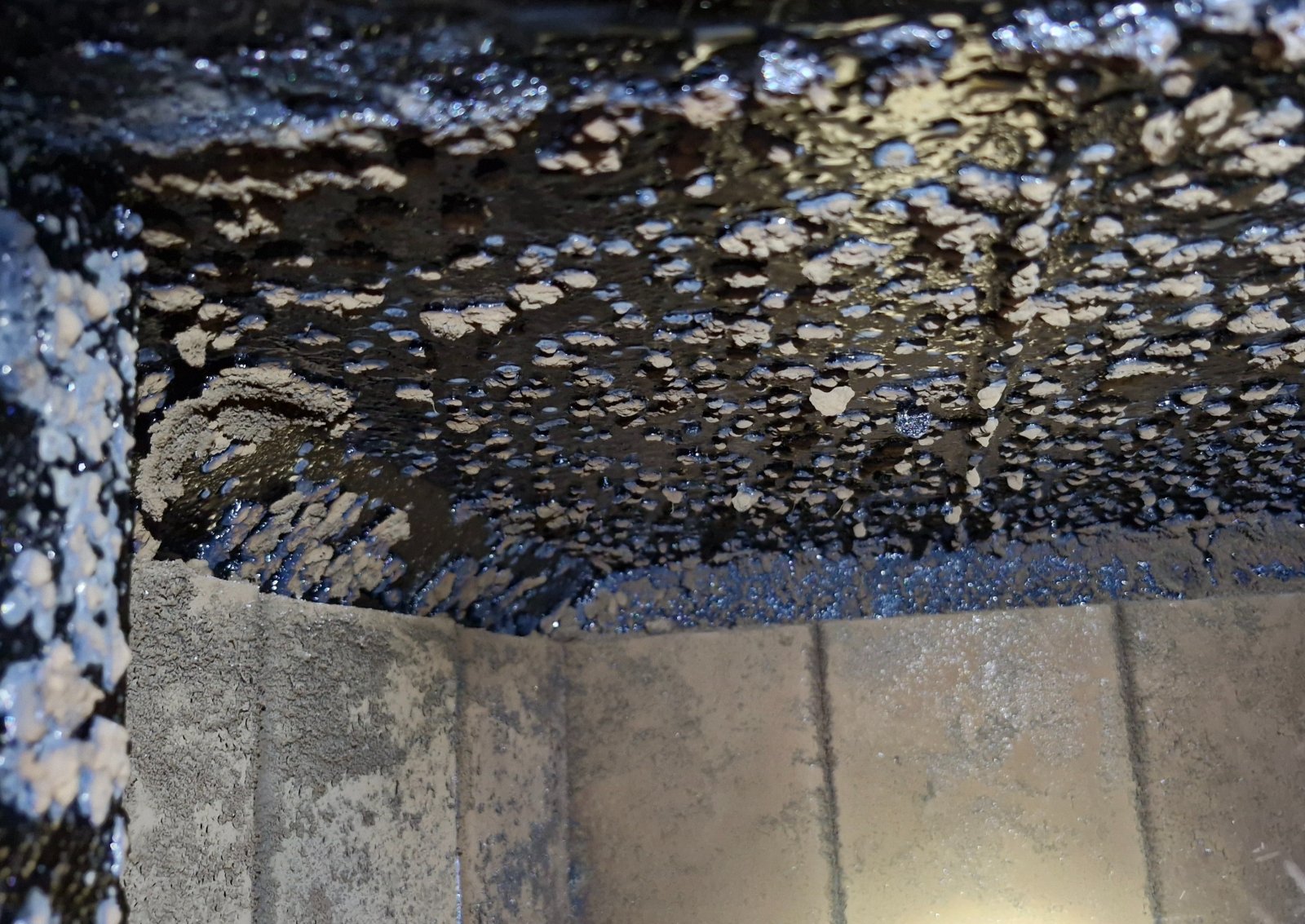 Teilweise ist der Glanzruß glatt und hart wie Klavierlack, teilweise sieht man wie er abtropft, fließt oder aufschäumt.