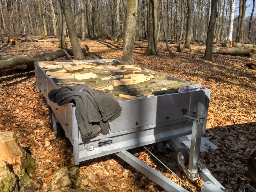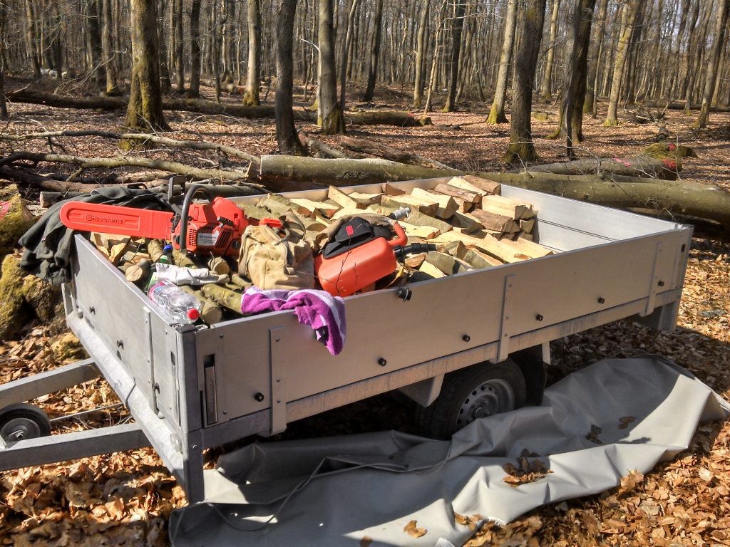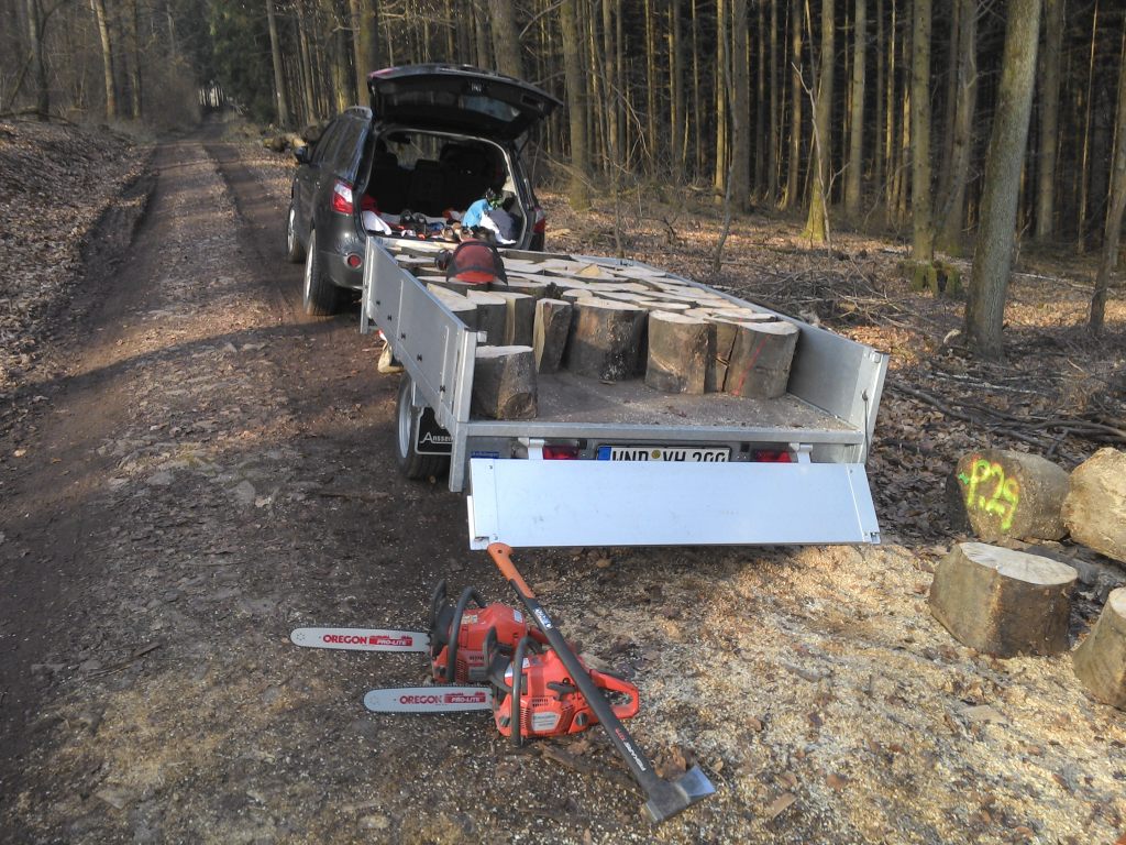 Oben habe ich meine bisherige Ausstattung beschrieben. Nun hatte der Nachbar einen guten Vorschlag. Die harte Knochenarbeit, das Holz auf Meterlänge mit der Schubkarre von der Straße ca. 120m bis an die hintere Grundstücksgrenze zu schieben, könnte leichter werden, wenn ich die Meterenden auf meinen Baumarkthänger lege. Dieser wird dann mit dem Rasentraktor, der noch zu beschaffen wäre, nach hinten gezogen, wo das Holz bis zum Spalten und Einlagern liegen bleiben darf.