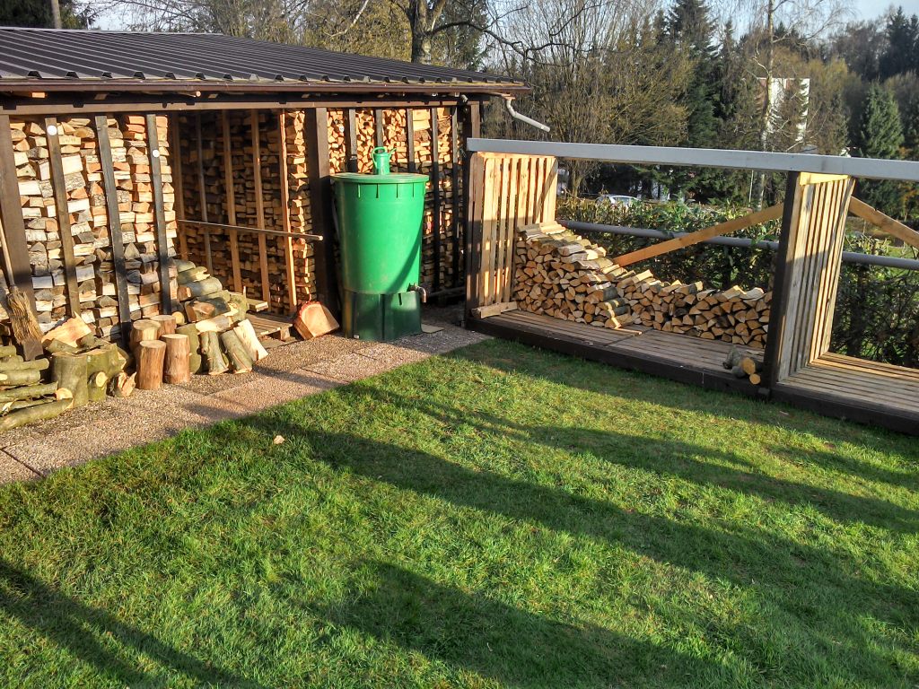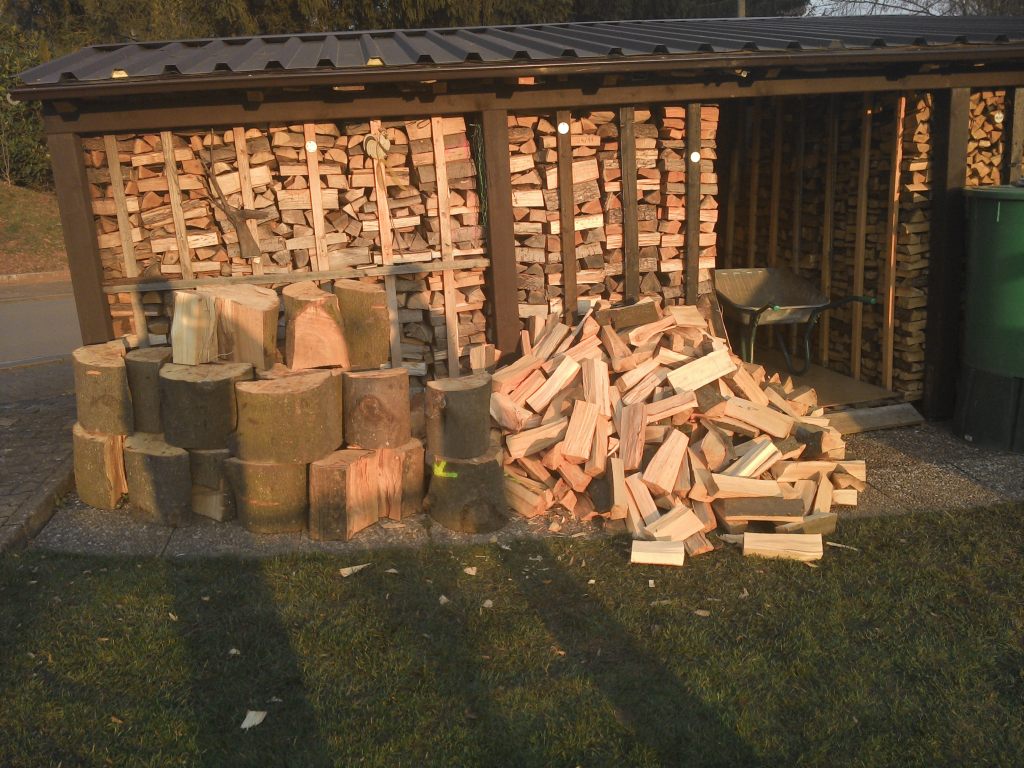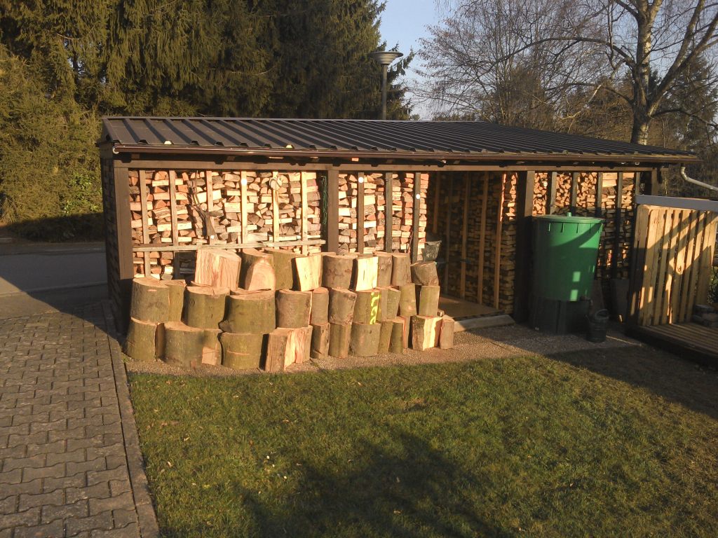 Nachdem die erste Heizsaison durch ist und der Gaszähler nur sehr wenig lief, habe ich im Garten, der zugegeben ausreichend groß ist, von meiner Frau die Genehmigung für die Erweiterung des Unterstands. dann dürfte ich Platz für etwa 100rm haben, was ein 4-5 Jahresvorrat ist.