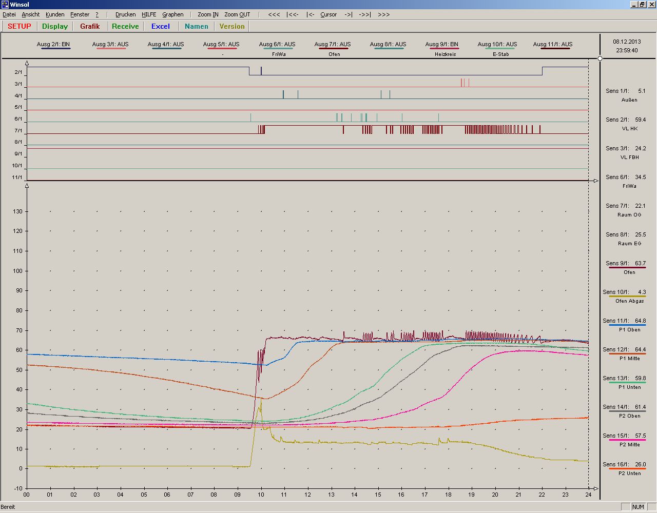 ich habe mich noch nicht dazu durchringen können, als Referenztemperatur einen anderen Pufferbereich zu wählen. Allerdings habe ich die Ein- und Ausschaltgrenze verändert (70° bzw. 66°). Hiermit konnte erreicht werden, dass die Pumpe bei sinkender Temperatur im Walltherm nicht durchläuft, sondern zum Schluss nur noch einige Male taktet.