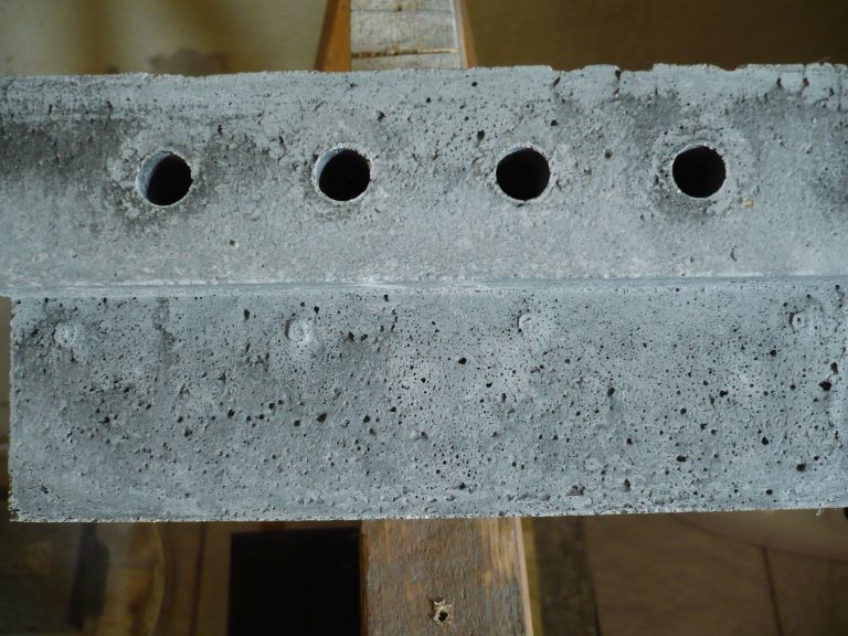 Düse 2 hat deutlich mehr und größere Lufteinschlüsse. Da hatte ich zu spät mit verdichten angefangen. Sind mal 4kg Beton in der Form bewegt sie sich nicht mehr stark genug.