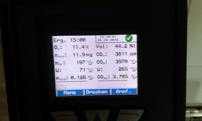 nach der ersten messung war das ergebnis ernüchternd. der co-wert war fast um das 4fache erhöht, der feinstaub war auch zu hoch (siehe upload). nachdem die ca. 20 minütige messung abgeschlossen war meinte der kaminkehrer, er möchte nun folgendes versuchen.