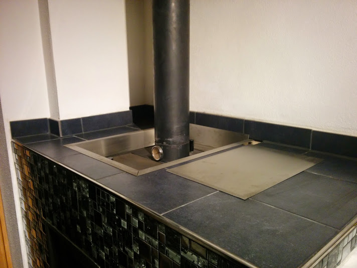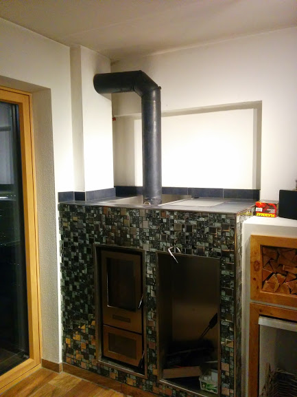 Unter den Kacheln ist der Ofen mit Schamotte Steinen ummauert, hinten weiterrauf weil dahinter die Couch steht. Wird ca. 30°-35° Warm (Wollte die Regierug daheim
