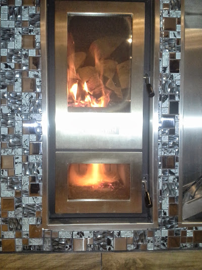 Rechts neben dem Ofen der Edelstahlrahmen ist komplett entnehmbar und oben ist auch noch ein Blech entnehmbar zum entlüften und Uhren ablesen.
