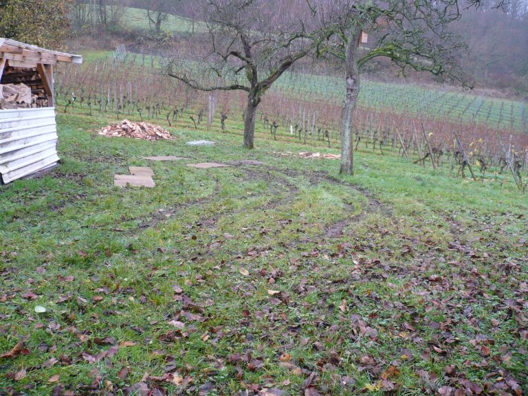 Die Wiese zu unserem Holzschuppen (links) ist ziemlich abschüssig, jahreszeitbedingt feucht und rutschig.