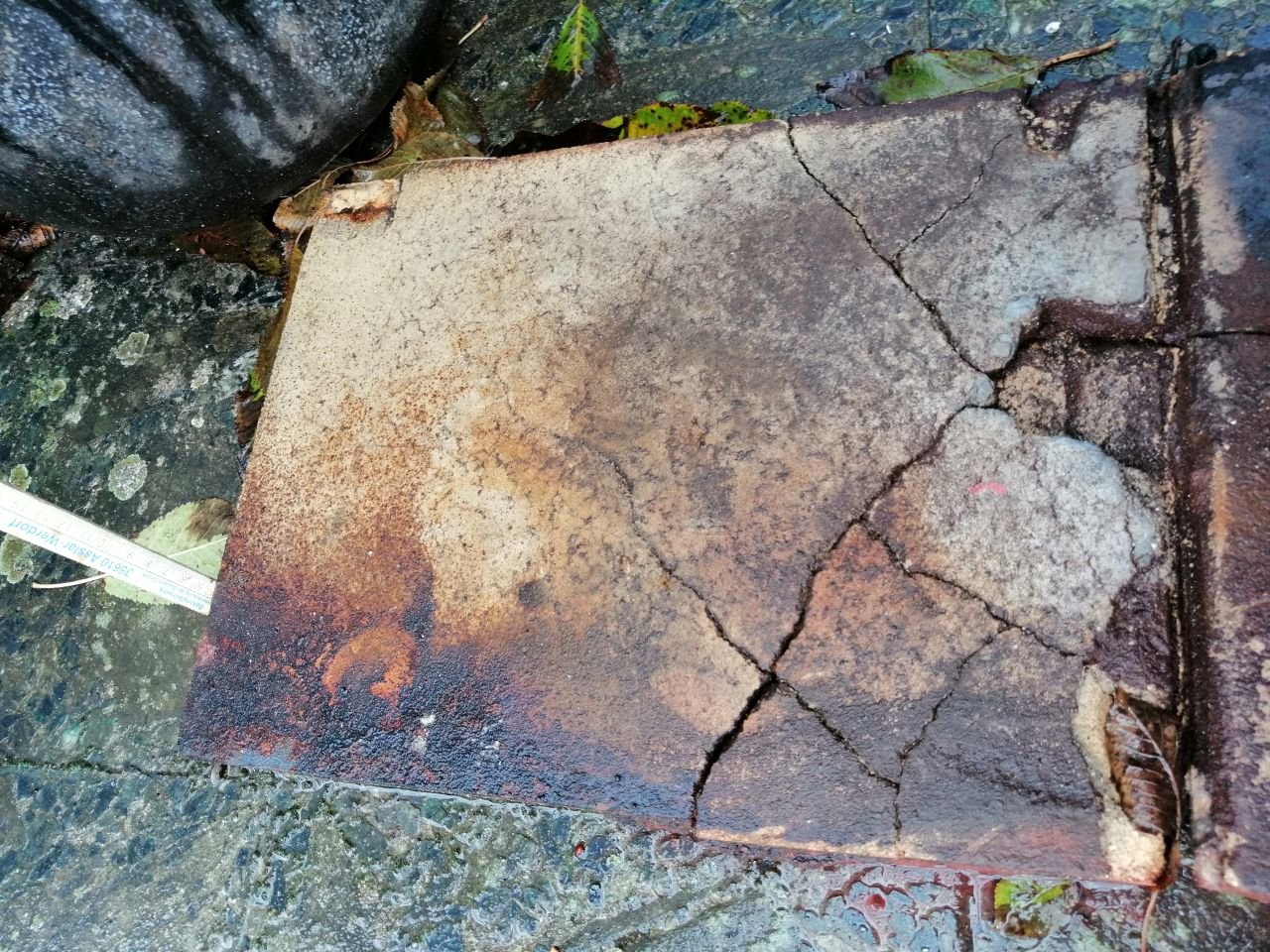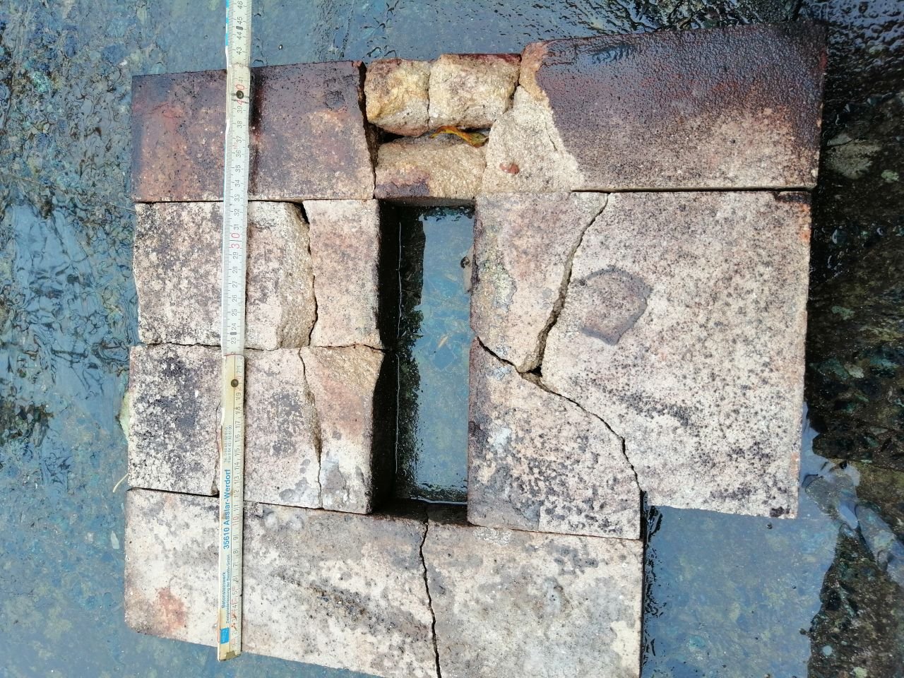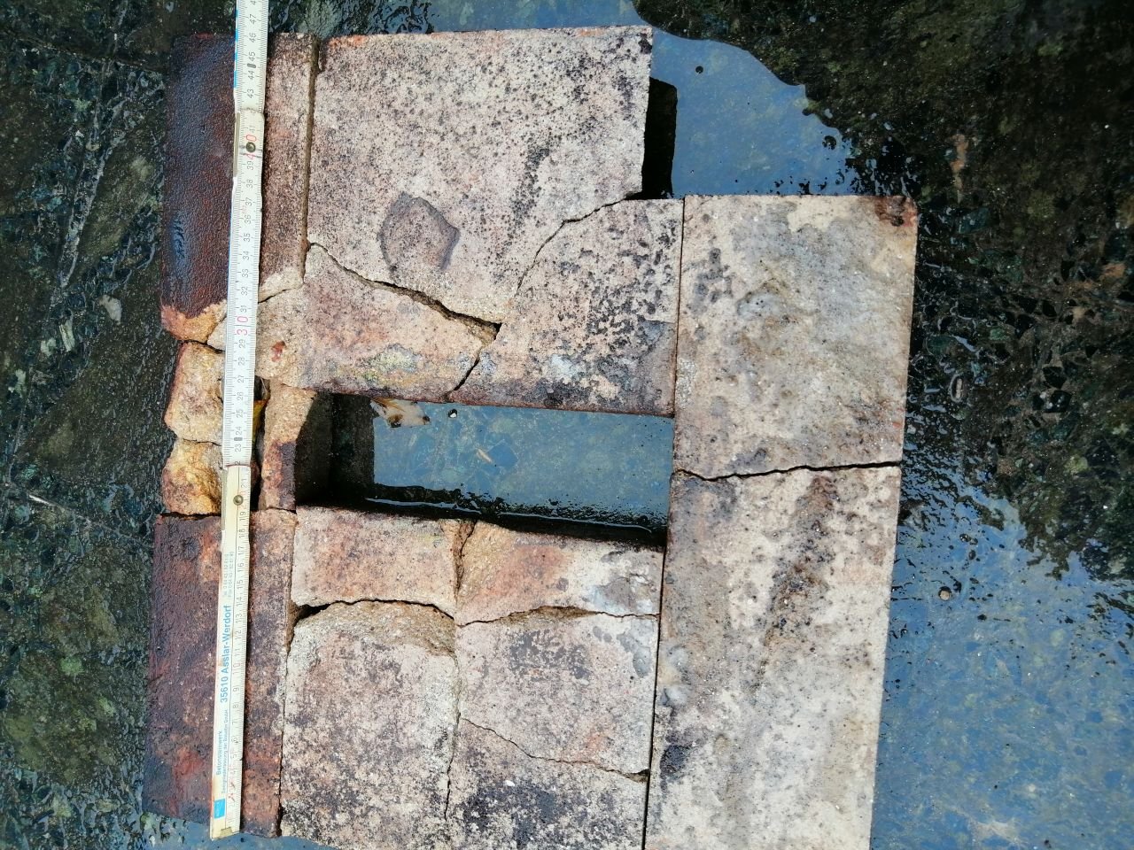 Rechts vorne scheint die Luft zugeführt zu werden. Der Stein hat da einen 45° Einschnitt. Rechts 50x216x194 Phase 50x50 93 tief