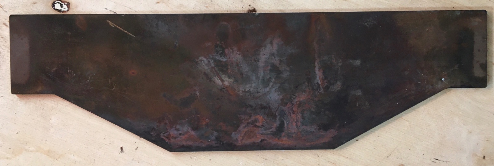 Ich werd’s im zweiten Step aber so machen, daß ich die Platte in zwei Hälften schneide und aufeinander klebe. So wird das Ganze dann 60 mm dick und steht im Ofen erstens ohne diese unansehnliche Schloßschraube von alleine, ohne beim Nachlegen in die Glut zu kippen und zweitens erhoffe ich mir, daß, wenn die Flammen noch 20 mm weiter weg von der Scheibe sind (heute 40 mm dicke Blende), ich dann die Blende ein gutes Stück kürzen kann (auf 200 mm) ohne den Abschirm- Effekt zu sehr zu reduzieren.
