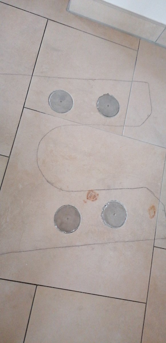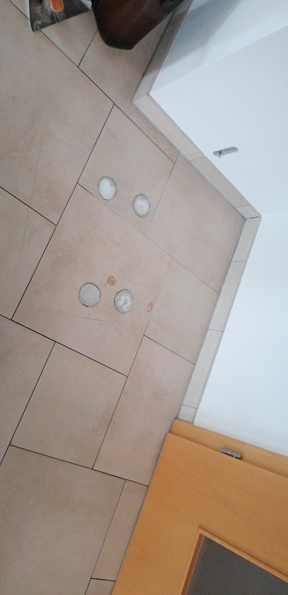 So. Kernbohrungen sind gemacht. Der Vergussbeton lieferte allerdings keine astrein plane Fläche, zudem ist er etwas geschrumpft beim Trocknen. Das Ergebnis war, dass mir hier und dort ca. 1mm zur absoluten Fliesenplanheit gefehlt haben. Also habe ich den Beton in jedem Loch gleichmäßig abgeschliffen und habe mit einer 1mm Edelstahlscheibe wieder ausgeglichen. Jetzt passen die Höhen.