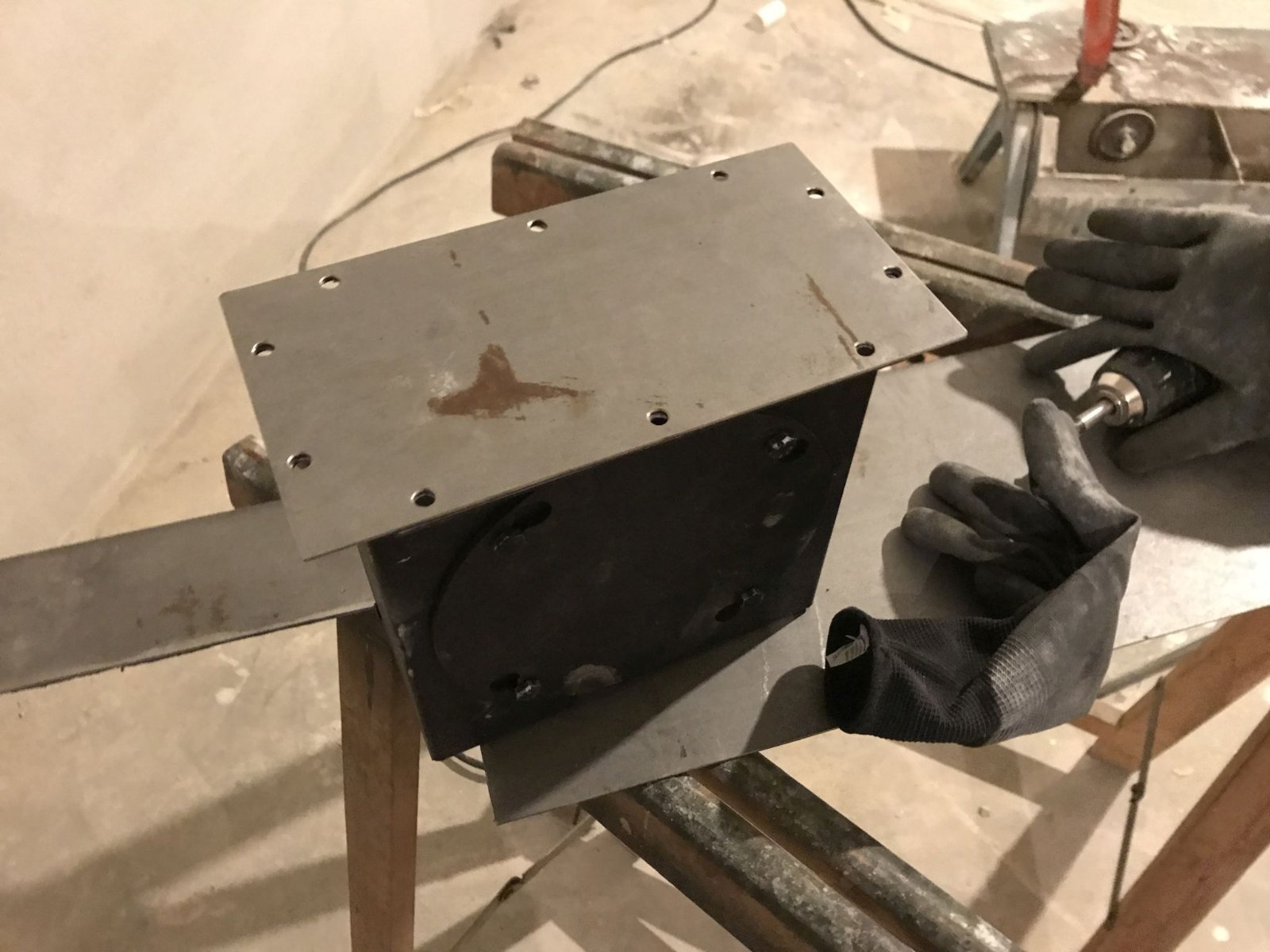 Transport rein: Aufstellung auf Erhöhung, damit der Ofen sauber auf dem Beton steht. Zwischen den Auflagen und dem Ofenfuß habe ich noch Dichtungspapier gepackt, dass das nicht evtl. mal knarzt. Abdeckblech um Totraum im Zuluftbereich zu vermeiden nicht dass da mal was kondensieren anfängt mit der kalten Zuluft. Nocken an der Anheizklappe zum Steuern des Zuluftventils sowie PT-100 (Aus dem Schrott, passte zufällig, wird demnächst ersetzt, wenn er aufgibt, da der nur bis 400°C spezifiziert ist und ein bischen warm am Gehäuse wird) im Abgasrohr zur Rauchgastemperaturmessung. Was im Betrieb auffällt, ist dass die Abgastemperatur immer recht hoch ist, und ich eher bei 170 °C bis 200 °C unterwegs bin, dabei ist die Rauchgasdrossel ziemlich weit zu: