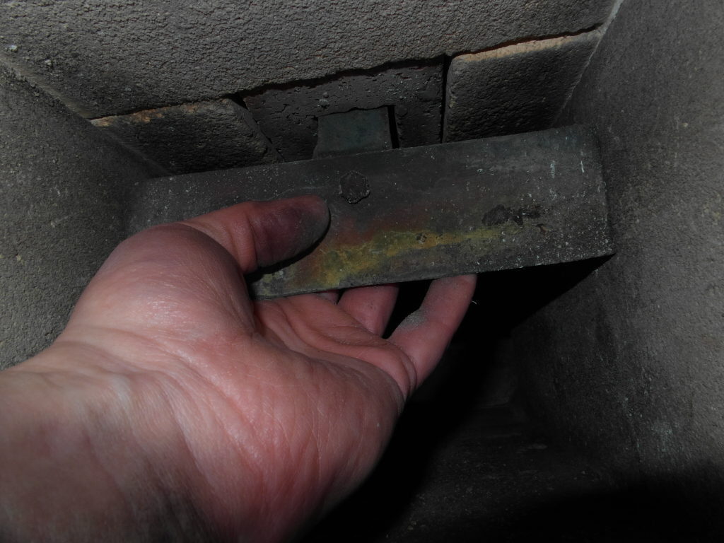 Mein zweiter Plan war, die Flamme in ihrer Richtung zu beeinflussen. Hierzu habe ich ein Blech an einer Halterung gebaut, die ich in den Betonbrenner hänge. Dieses Blech ist nicht sehr groß und stört mich auch nicht bei der Sicht aus der Sitzposition im Wohnzimmer.