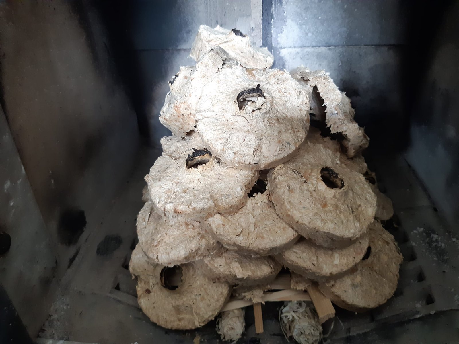 Unterkonstruktion mit zwei runden Kaminbriketts (mit Loch), also rund 4 kg in meistens nur