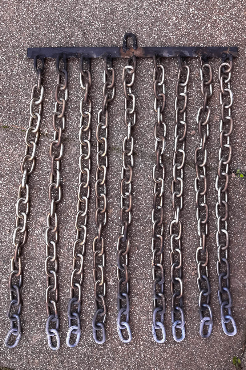 Das Flacheisen ist 36,5cm lang, die 50cm langen Ketten sind im Abstand von 4cm angeschweisst.